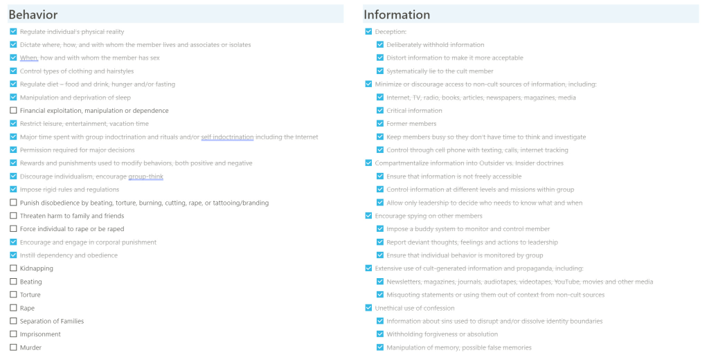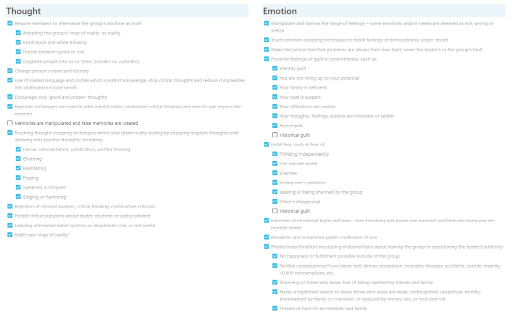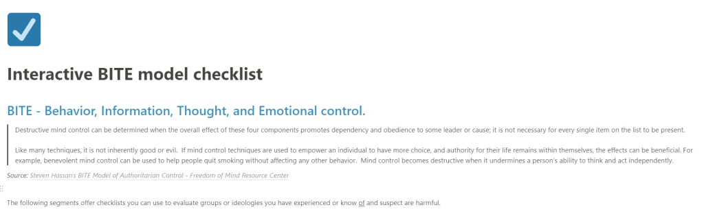 I looked at it today. I was stunned. I had believed this whole time that while the BITE model is helpful, it was something I’d only use as a thing to help label why certain experiences were wrong, but not ever to label my overall experience or anything because even though I use the word sometimes, I wasn’t in anything REALLY like a cult, those are way worse. I was just in some unhealthy pressures and groups and media messages and I’m just over-sensitive about things right now, and in a few years I’ll have mellowed out a lot and see my experiences and the good-hearted people behind all my old groups in the much more balanced, kind, and favorable light that they really exist in, rather than my over-compensating bitterness and blinders.